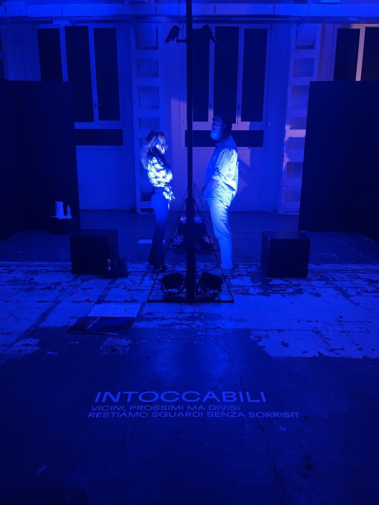 Sono stata alla mostra del collettivo nonecollective.it e mi ha molto colpito un lavoro, tra i tanti, che ho trovato molto interessante: si chiama “Intoccabili: vicini, prossimi ma divisi, restiamo sguardi senza sorrisi”. La proposta artistica riguarda l’idea di poter agire, l’uno con l’altro, solo guardandosi, tenendo la propria mascherina sul viso, facendo dei gesti che indichino connessione, ma che può essere espressa esclusivamente attraverso un plexiglass che ci tiene alla giusta distanza di “sicurezza”. Forse, quello che potremmo chiederci è quale sia la sicurezza a cui aspiriamo e in che modo potremmo sentirci sicuri e non in pericolo dopo aver trascorso 16 mesi in una realtà disinfettata. Le relazioni rarefatte, diventate quasi invisibili, sono realissime, o dovrebbero tornare tali. La distanza fisica, vista come distanza spaziale, ci ha portati a vivere anche una distanza sociale, o quanto meno una difficoltà a vivere accanto a proiezioni dell’io, desideri, opinioni, scambi, confronti.
