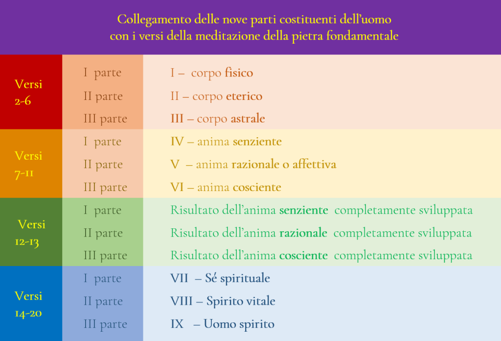 Il testo della meditazione della pietra fondamentale (di cui dà una bellissima lettura anche il testo di Giorgio Tarditi Spagnoli) corrisponde a quello recitato da Rudolf Steiner alla fine dell’ultima conferenza del Convegno di Natale del 1 gennaio 1924.