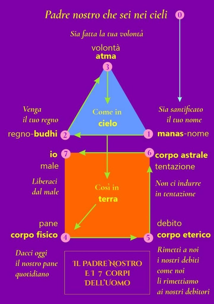 Si tenga anzitutto presente che il “Padre nostro” si articola, dopo l’invocazione iniziale, in sette formule: le prime tre – come spiega Steiner – riferite al Sé spirituale (Manas), allo Spirito vitale (Buddhi) e all’Uomo spirituale (Atman), ovvero a quanto è in potenza nell’Io e che l’Io stesso è chiamato perciò in avvenire ad attuare; le seconde quattro riferite invece alle sue “quattro parti costitutive inferiori”: vale a dire, al corpo fisico, al corpo eterico, al corpo astrale e all’ego (cioè al riflesso psico-fisiologico dell’Io).