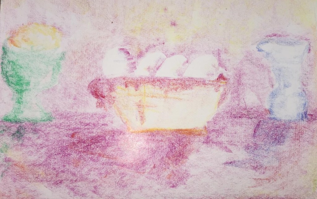 Con qualsiasi strumento artistico (pastelli, gessetti, soft pastels, acquerelli, etc.) creare un’opera utilizzando solo i colori bianco-viola (in qualsiasi tonalità). Utilizzare un foglio piccolo, ad esempio un A5 o al massimo A4 affinché possiate poi meditare la sera, prima di addormentarvi, sull’opera realizzata. E’ consigliabile meditare dopo la retrospettiva e non prima.